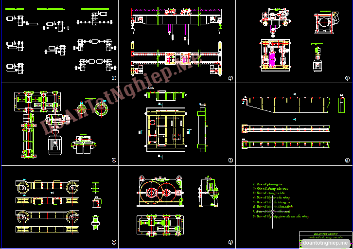 -Dầm cuối bao gồm hai dầm kiểu hộp, trên có lắp bánh xe di chuyển trên thanh ray đặt dọc nhà xưởng.